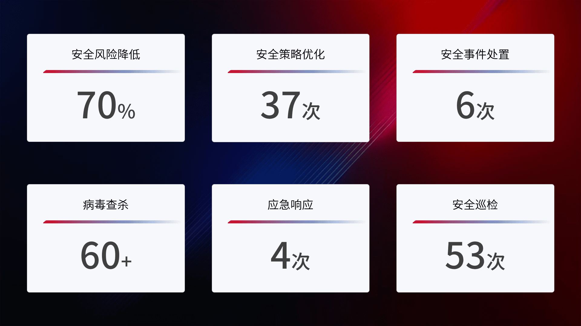 提供全面的安全事件报告体系,,,,包括处置报告、、、周报、、、、季度和年度总结,,结合持续监控,,,帮助客户深入了解网络安全状况。。。
